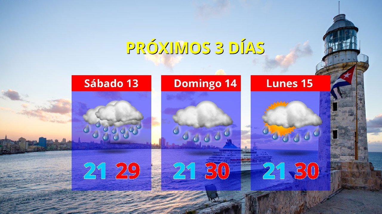 En cuanto a las temperaturas, la propia fuente precisó que las mÃnimas serán de 24 grados Celsius (°C) en zonas costeras y de 23 °C en el interior del territorio, mientras que las máximas tendrán un valor cercano a los 30 °C.
