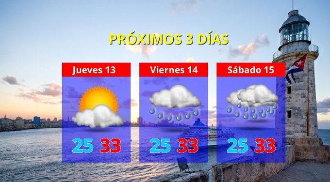 Para los próximos tres dÃas, agregó la propia fuente, la probabilidad de lluvias será relativamente baja el jueves y se incrementará a partir del viernes, con la proximidad de una baja superior en los niveles altos, en interacción con el fuerte calentamiento diurno, suficiente contenido de humedad y el tránsito de ondas tropicales al sur de Cuba.