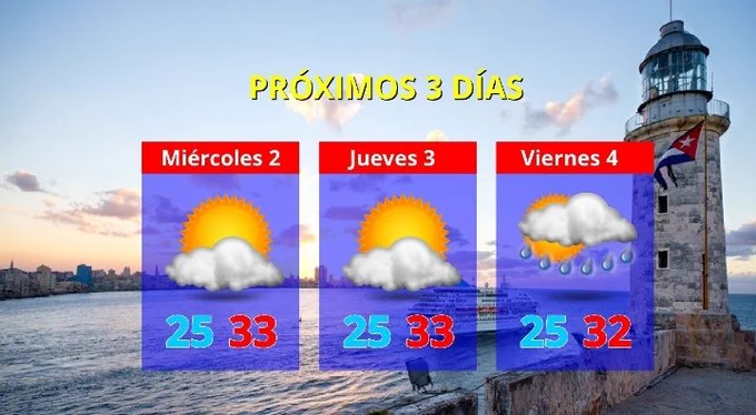 Para los próximos tres días, agregó la propia fuente, predominará la débil influencia anticiclónica en la superficie, aunque en las tardes el fuerte calentamiento diurno, suficiente contenido de humedad y el tránsito de una onda tropical al sur de Cuba, incentivarán la ocurrencia de algunos chubascos y tormentas eléctricas.