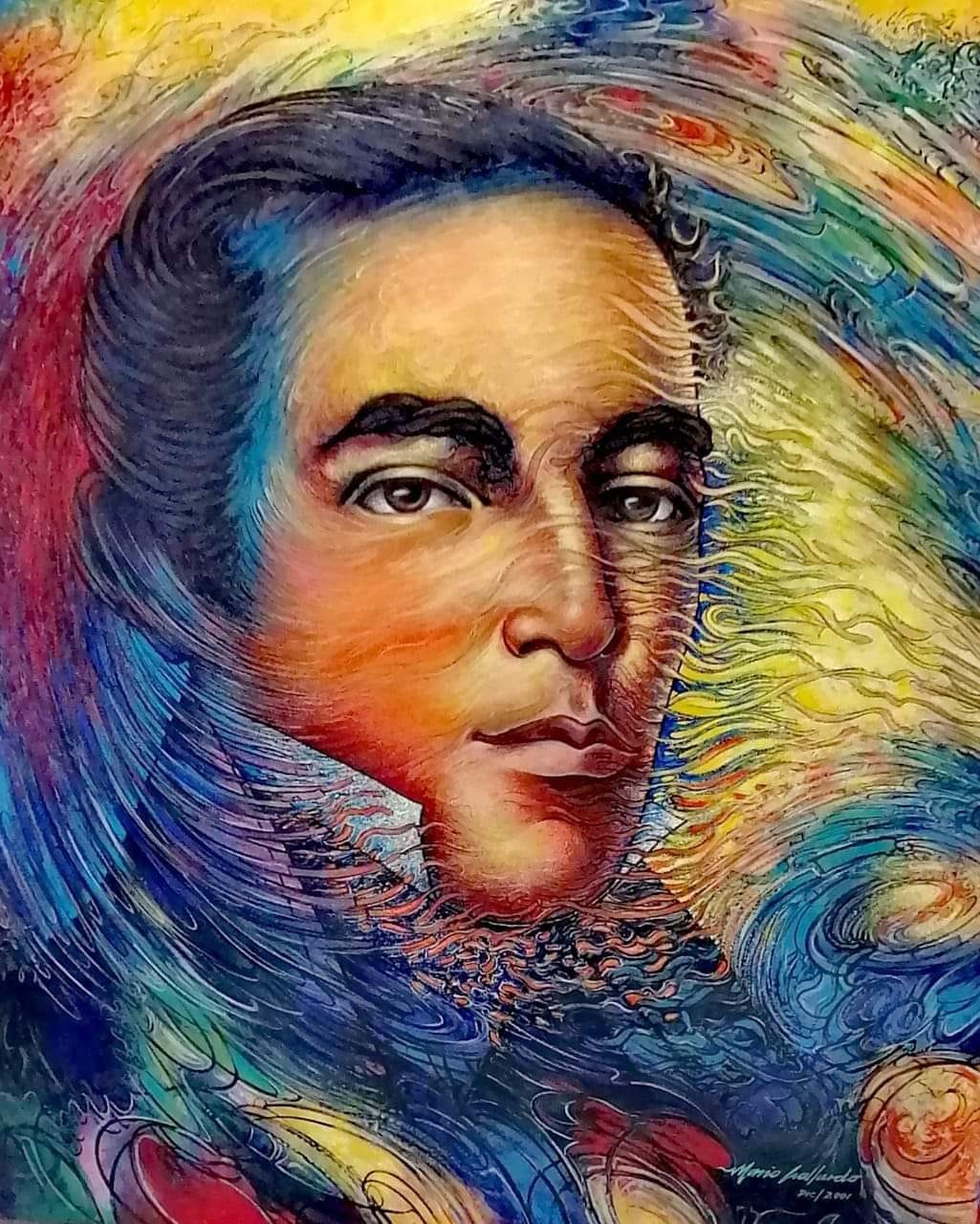 La obra, precisó la propia fuente, está inspirada en el retrato original que se conoce de Heredia en su estancia en tierras aztecas. La técnica empleada es un acrÃlico sobre tela de 180 por 150 centÃmetros de dimensiones, pintado en el año 2001.