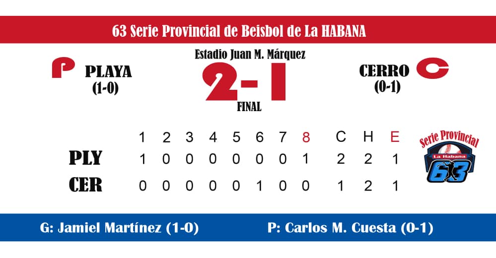 En el otro desafío disputado en el parque del conocido barrio El Palmar, el seleccionado de Playa tuvo un debut triunfal al imponerse dos anotaciones por una a su par del Cerro en el primer duelo que se decide mediante la regla de desempate de la Confederación Mundial de Béisbol y Softbol.