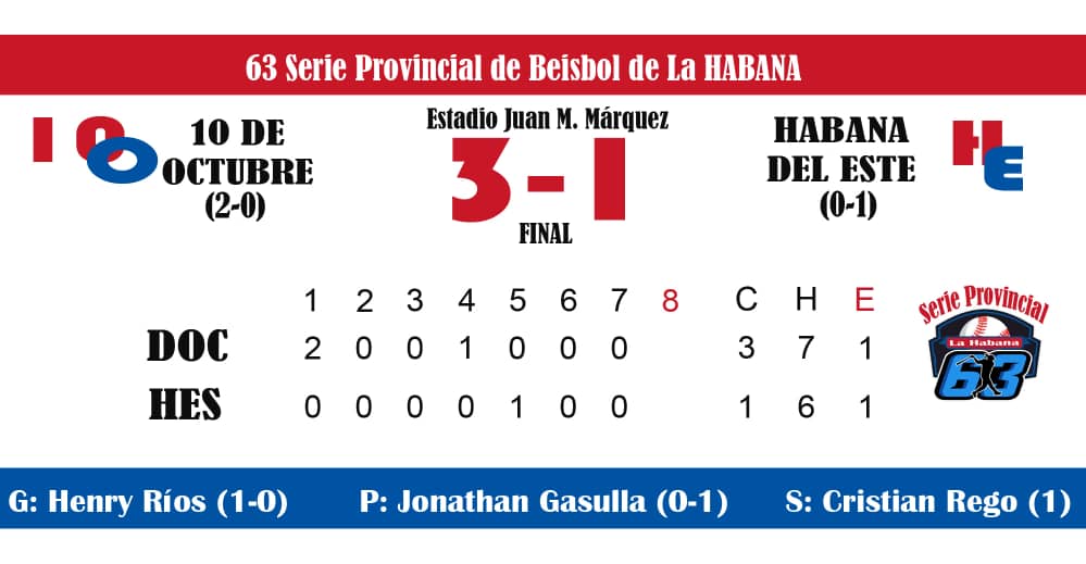 En el estadio Juan Manuel Márquez, de Marianao, los octubrinos se impusieron tres carreras por una a Habana del Este, en choque que decidieron en la misma primera entrada cuando fabricaron par de anotaciones.