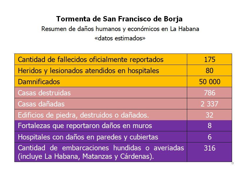 Tabla resumen de los daños causados por el evento meteorológico en la capital. Foto tomada del sitio web de la emisora Habana Radio. |
