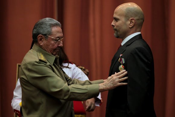 | El General de Ejército Raúl Castro Ruz coloca la medalla correspondiente al tÃtulo de Héroe de la República de Cuba a Gerardo Hernández Nordelo. Foto tomada del sitio web Cubadebate. |