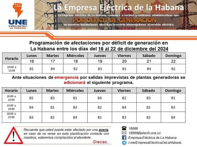 La Empresa Eléctrica de La Habana informó a vecinos y entidades administrativas de la capital que por déficit de generación en las instalaciones del sector ocurrirán interrupciones en el servicio del 16 al 22 de diciembre.