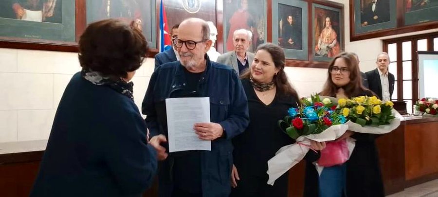 El trovador y poeta, Silvio Rodríguez, recibió la Distinción Familia Patria que otorga por primera vez la Sociedad Económica de Amigos del País, lauro que merecieron su esposa, la flautista Niurka González, y su hija, Malva Rodríguez.