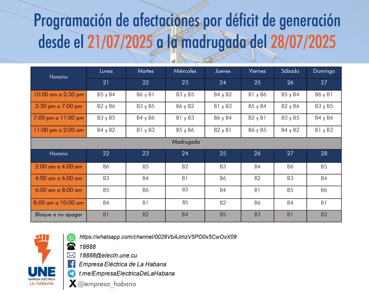 La Empresa Eléctrica de La Habana informó este domingo a vecinos y entidades administrativas de la capital, que por déficit de generación en las instalaciones del sector ocurren interrupciones en el servicio desde este 21 de julio hasta la madrugada del día 28.