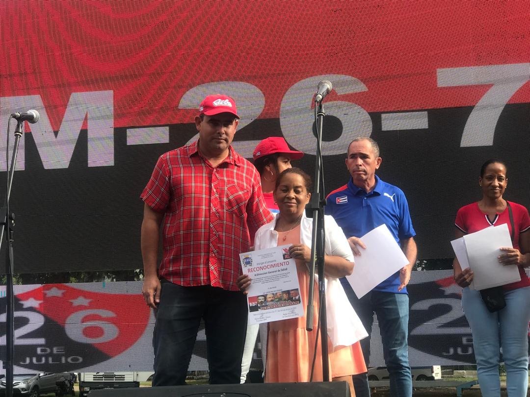 La celebración, por el aniversario 72 de los asaltos a los cuarteles Moncada y Carlos Manuel de Céspedes, fue oportuna para entregar el carné del PCC a trabajadores destacados y distinguir por su labor en el municipio a entidades y organismos, como Universal Habana, Suchel Cetro, Dirección General de Educación, Cultura y los Comités de Defensa de la Revolución (CDR), entre otros.
