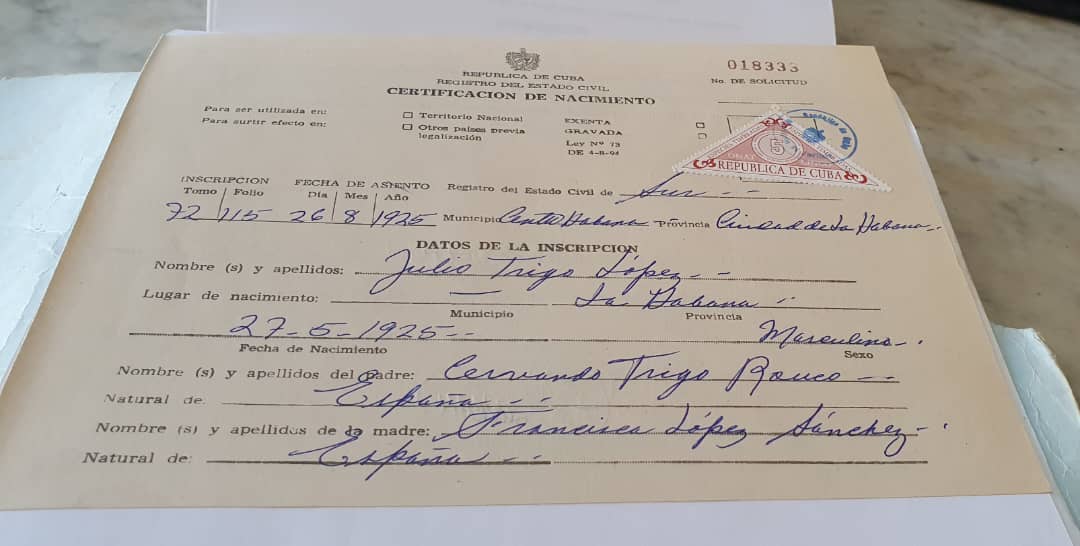| Muestra de la Certificación de Nacimiento de Julio Trigo. Foto: enviada por la autora. |
