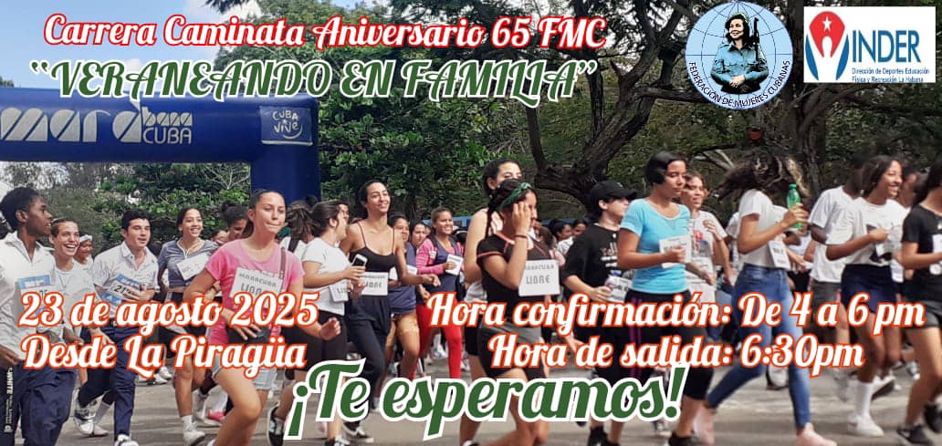 La Dirección Provincial de Deportes, Educación Física y Recreación en La Habana, junto a la Federación de Mujeres Cubanas, convoca a la carrera caminata femenina “Veraneando en Familia”, como parte del programa de verano y en saludo al 65 aniversario de la organización. El evento se celebrará el 23 de agosto en el circuito del malecón habanero, con distancias de 5 y 10 kilómetros.