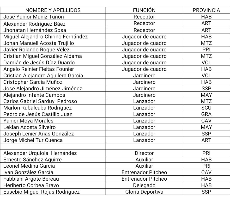 Además de La Habana, la nómina de 20 atletas cuenta con jugadores de otros nueve territorios cubanos, Artemisa (3) Matanzas (3), Pinar del Rio (1) Villa Clara (2) Sancti Spiritus (2), Mayabeque (2), Granma (1), Ciego de Ávila (1), Santiago de Cuba (1).