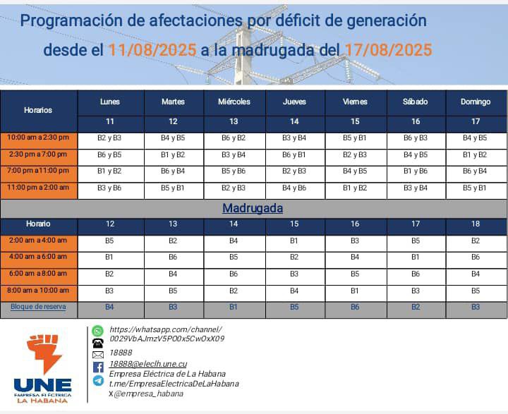 La Empresa Eléctrica de La Habana informa este domingo a vecinos y entidades administrativas de la capital, que por déficit de generación en las instalaciones del sector ocurrirán interrupciones en el servicio desde el día 11 hasta la madrugada del 18 de agosto.