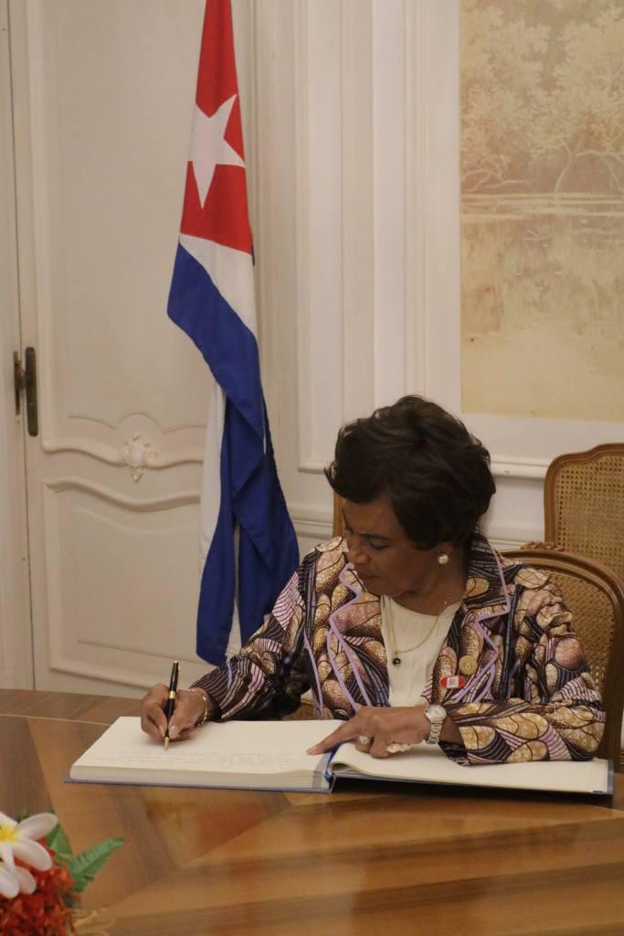 Carolina Cerqueira al firmar el libro de visitantes del Centro Fidel Castro Ruz. Foto tomada del sitio web del periódico Tribuna de La Habana. |