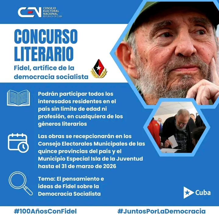 Asimismo, da a conocer que el Consejo Electoral Nacional de la República de Cuba convoca al concurso literario Fidel, artÃfice de la democracia socialista.