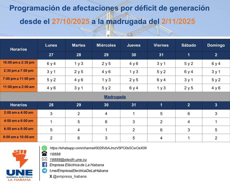 La Empresa Eléctrica de La Habana informó este domingo a vecinos y entidades administrativas de la capital, que por déficit de generación en las instalaciones del sector ocurrirán interrupciones en el servicio desde este lunes y hasta las 10:00 (hora local) del 3 de noviembre.