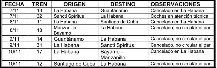 La dirección de la Unión de Ferrocarriles de Cuba, informa a toda la población, que teniendo en cuenta el proceso de recuperación de la infraestructura ferroviaria a partir de los impactos identificados originados por el huracán Melissa por la región oriental del país, se ha decidido mantener canceladas las salidas de los trenes nacionales de pasajeros que se relacionan en la tabla anexa.