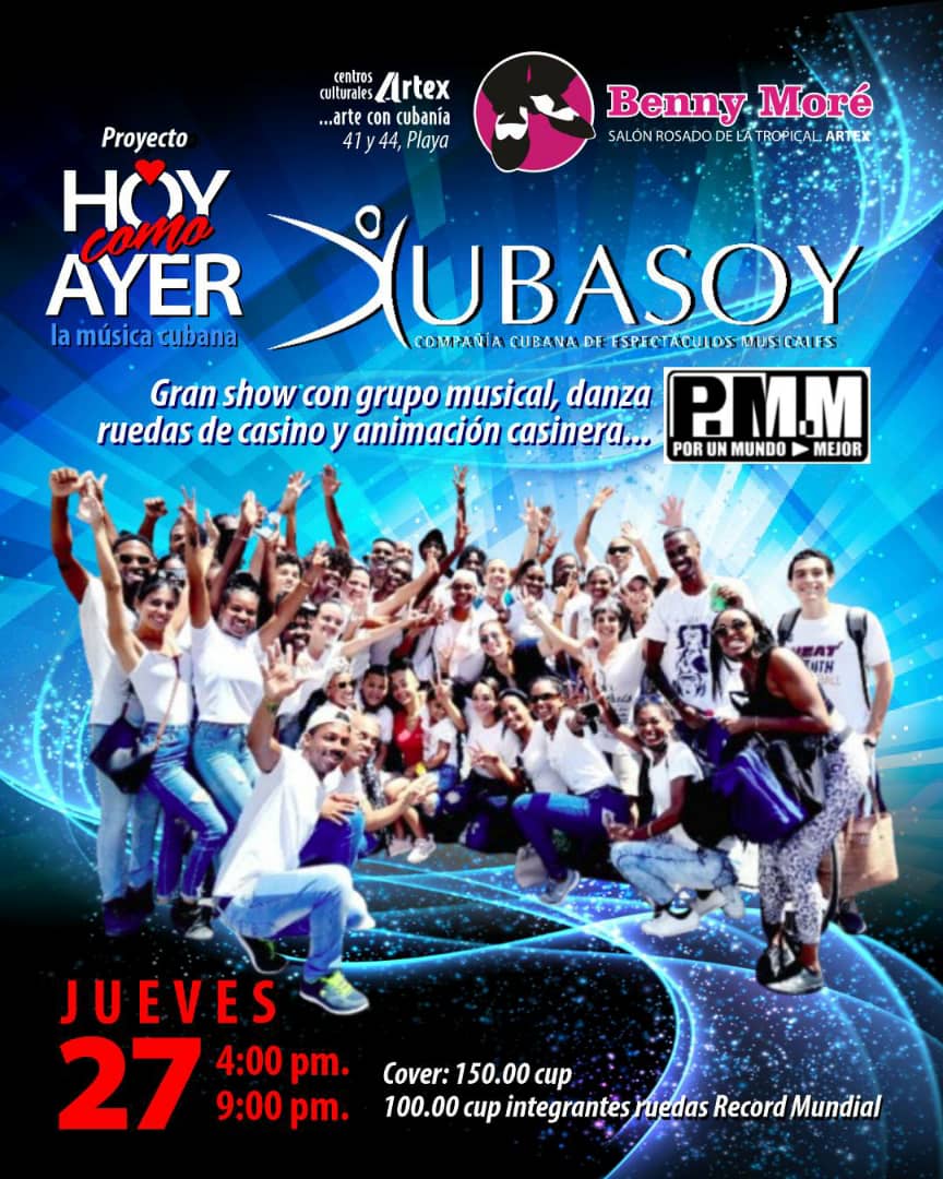 La compañía cubana de espectáculos musicales Kubasoy, junto a la compañía PMM, referentes de la vida cultural en La Habana, proponen un gran show desde las 16:00 y hasta las 19:00 (hora local) para que los bailadores disfruten de una tarde noche al ritmo de la energía contagiosa que siempre garantiza el proyecto Hoy como Ayer, dirigido por la creadora artística Elizabeth Salas.